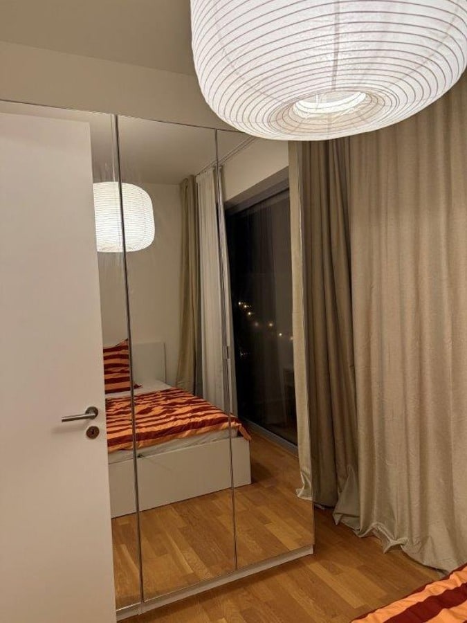 - Big wardrobe with mirrors and double bed, including bedding.